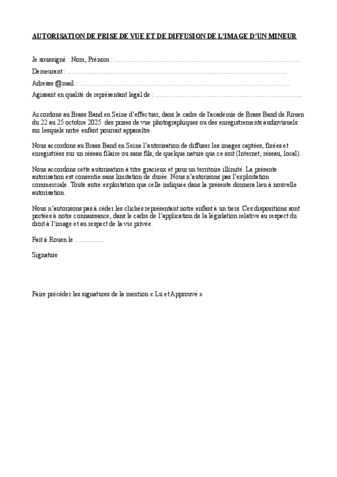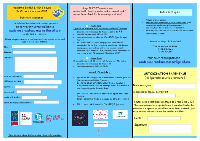 Bulletin d'inscription ( et prise de vue pour les mineurs ) à renvoyer à : academie.brassbandenseine@gmail.com