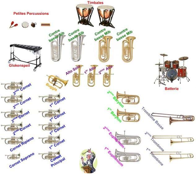 Un Brass Band est disposé en U sur 2 rangs, les musiciens étant relativement serrés les uns contre les autres, il doit obligatoirement comporter les instruments suivant :